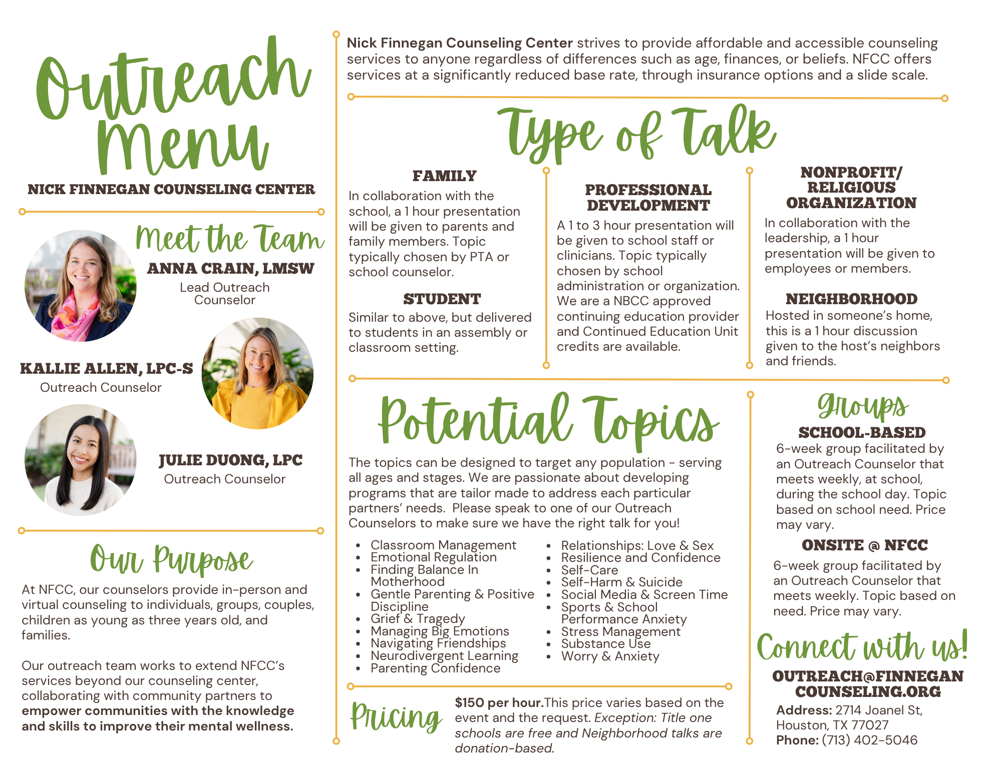 Our outreach team works to extend NFCC’s services beyond the counseling center, collaborating with community partners, so that they can empower their communities with the knowledge and skills to improve their mental wellness.